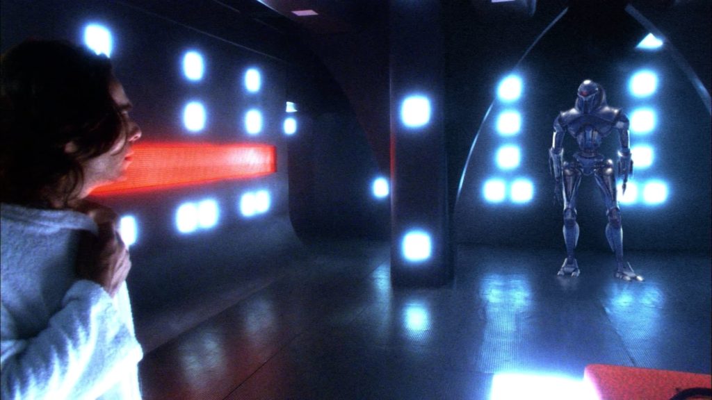 Tyrol participates in the Circle, a secret tribunal on Galactica that tries and convicts in absentia those accused of collaborating with the Cylons during the Occupation. The death sentences–administered without the knowledge of Roslin or Adama–begin to weigh on Tyrol’s conscience. Baltar faces a similar jury among the Cylons, who must decide whether he is allowed to stay with them.